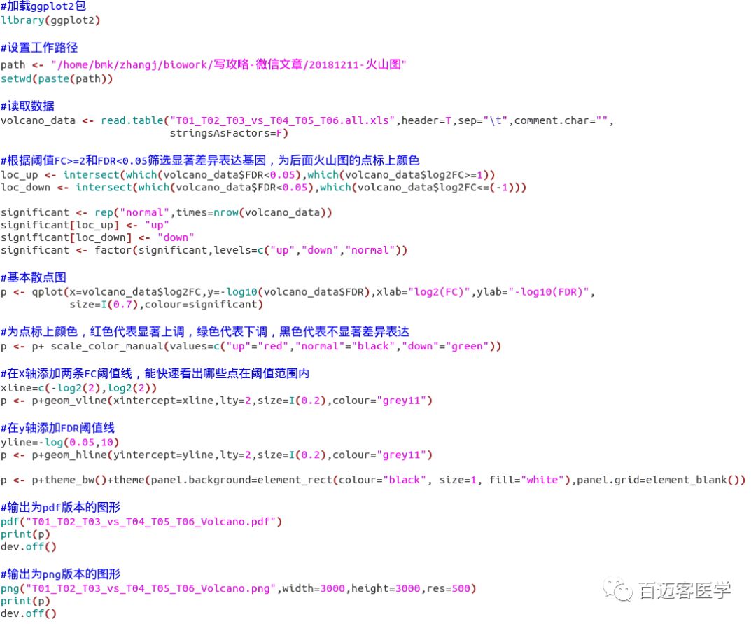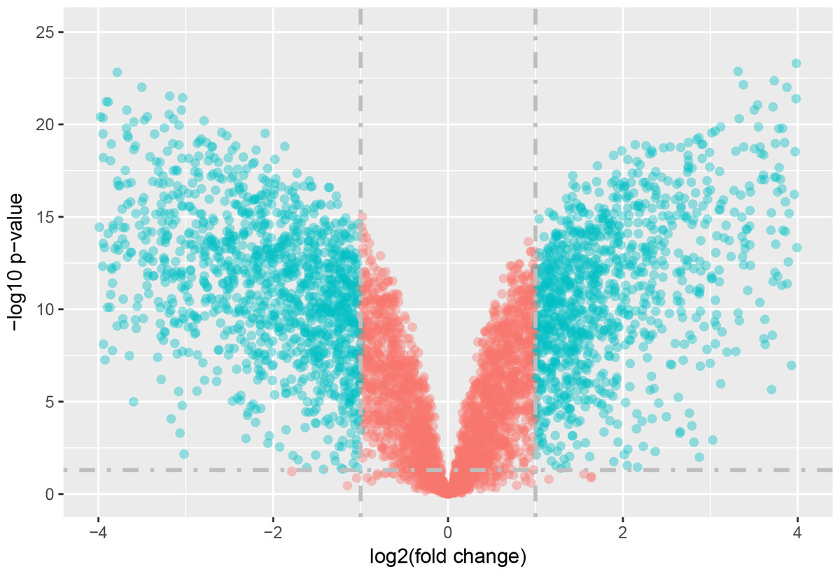 一般差異表達(dá)分析中會(huì)同時(shí)控制這兩個(gè)參數(shù)來篩選顯著差異表達(dá)基因,如取FDR<0.05和FC≧2?;鹕綀D可以直觀地展現(xiàn)所有基因的FDR與Fold Change之間的關(guān)系,以便快速查看基因在兩組樣品間表達(dá)水平的差異程度和其統(tǒng)計(jì)學(xué)顯著性。火山圖的本質(zhì)其實(shí)就是散點(diǎn)圖。橫坐標(biāo)表示某一個(gè)基因在兩樣品中表達(dá)水平差異倍數(shù)的對(duì)數(shù)值,即log2(FC);橫坐標(biāo)絕對(duì)值越大,說明基因表達(dá)量在兩樣品間的倍數(shù)差異越大??v坐標(biāo)表示FDR的負(fù)對(duì)數(shù)值,即-log10(FDR)。縱坐標(biāo)值越大,表明差異表達(dá)越顯著,篩選得到的差異表達(dá)基因越可靠。下面,小編就手把手教你如何繪制火山圖啦。