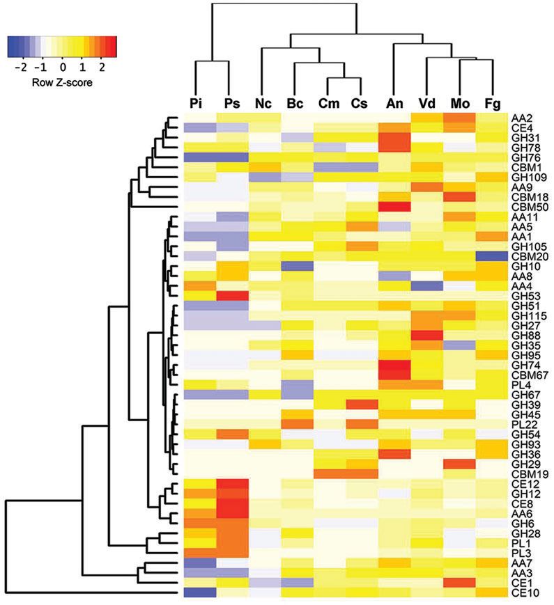 成熟的植物致病真菌可以分解并利用CAZymes的植物細胞壁多糖。尾孢菌(Cercospora sojina)含有596個預測的CAZymes。與其他真菌相比,C.sojina具有更大的潛在碳水化合物酯酶組,其可催化取代糖的N-去?;T?em>C. sojina基因組中,有大約23.5%的潛在分泌蛋白被預測為CAZyme,證明C.sojina可能在入侵期間使用大量CAZymes來消化宿主細胞壁。有趣的是,其中一個CAZymes家族,即糖苷水解酶GH109家族,是高度富集的(圖6)。