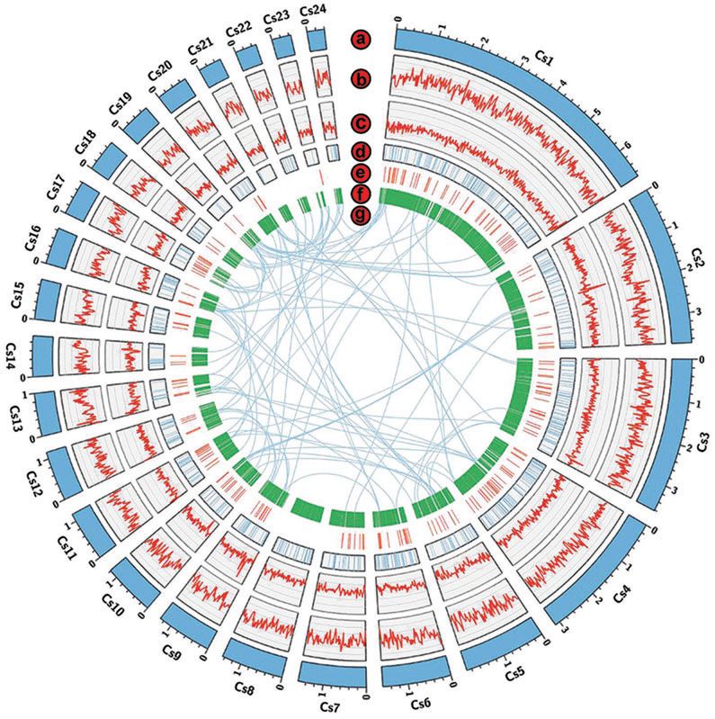 使用CANU從頭組裝測序數(shù)據(jù)(4,920,479,113bp clean reas),N50長度為1.59Mb,總組裝大小約為40.84Mb(表1)。通過circos-plot顯示了24個最大的支架(圖1)。預測共11,655個蛋白質(zhì)編碼基因,其基因密度為每1 Mb約285個基因。在基因組中預測了277個tRNA和281個假基因。RNA-seq數(shù)據(jù)顯示有8,474個推定的蛋白質(zhì)編碼基因。