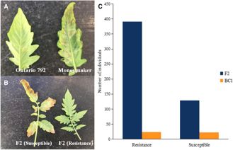 為考察Cf-10的遺傳基礎(chǔ),作者對品種Ontario 792,Moneymaker及其F1,F(xiàn)2與BC1F1群體的抗病能力進(jìn)行評估。結(jié)果顯示,品種Moneymaker對10種病菌生理小種表現(xiàn)敏感,而Ontario792均表現(xiàn)顯著抗病能力,暗示Ontario792對番茄葉霉病菌具有廣譜抗病能力;所有F1代個體均表現(xiàn)抗病,F(xiàn)2代抗病與感病個體呈現(xiàn)3:1分離比,暗示Cf-10受顯性單基因控制,并且BC1F1的表型分離比驗證了這一結(jié)果(圖2.)。