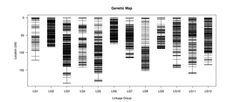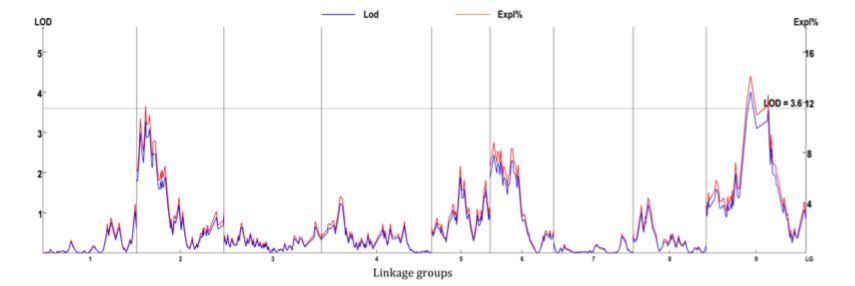 開(kāi)發(fā)了185,349個(gè)SLAF標(biāo)記,其中,20,250個(gè)SLAF標(biāo)記可以成功分型,最終上圖的標(biāo)記為4787個(gè),分布于9個(gè)LG中,構(gòu)建一張平均圖距為0.22cM的遺傳圖譜(如下圖),標(biāo)記間最大gap超過(guò)10cM,這可能是由于小孢子培養(yǎng)構(gòu)建DH群體的過(guò)程中,可能某種基因型更容易形成胚胎和再生植株,從而產(chǎn)生偏分離或某段染色體區(qū)域中無(wú)個(gè)體發(fā)生重組。