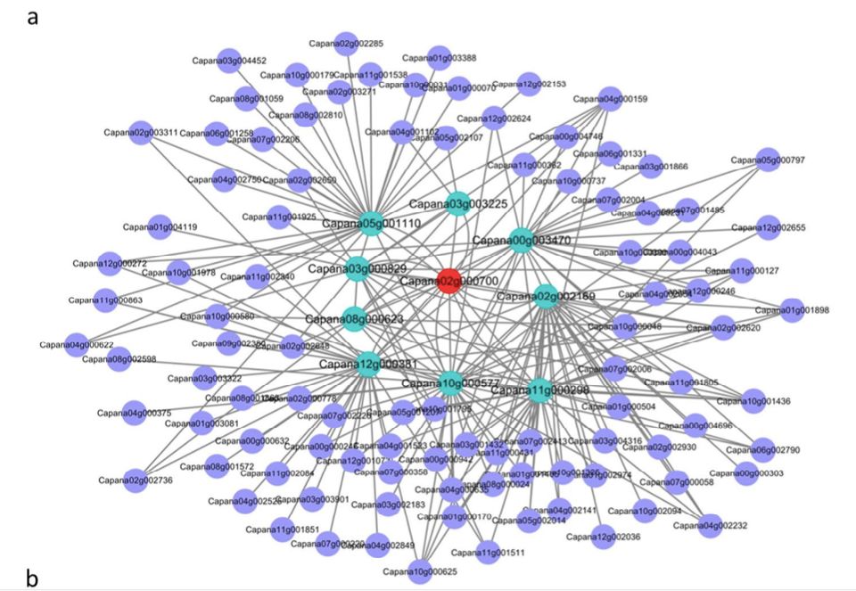 利用之前研究的不同發(fā)育階段和不同組織部的WGCNA分析結(jié)果,找到了花器官發(fā)育特定模塊,其中包含107個(gè)基因。這些基因中10個(gè)為T(mén)Fs,其中就包含已鑒定的Capana02g000700,這表明這些TFs可能與花發(fā)育的轉(zhuǎn)錄調(diào)控相關(guān)。這107個(gè)基因中,發(fā)現(xiàn)9個(gè)基因與Capana02g000700高度共表達(dá),分為3個(gè)家族,且其功能均與花發(fā)育相關(guān)。上述,均表明Capana02g000700通過(guò)抑制靶基因和/或TF表達(dá)來(lái)控制花器官發(fā)育,進(jìn)而影響花期。