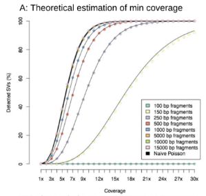 根據(jù)兩個人類數(shù)據(jù)集的錯誤情況和read長度,作者對兩條人的染色體模擬了50X?Pacbio?和ONT?read 。純粹的統(tǒng)計分析發(fā)現(xiàn),近10X覆蓋度的數(shù)據(jù)(平均長度10kb)就足夠去推斷所有SV斷點(一瞬間覺得自己可以省好多錢有木有),然而對于100bp的短read雙端測序至少要25X覆蓋度。當前這個統(tǒng)計只是一個理想情況,比如缺乏了重復和覆蓋度的偏移,因此是低估了所需的覆蓋度