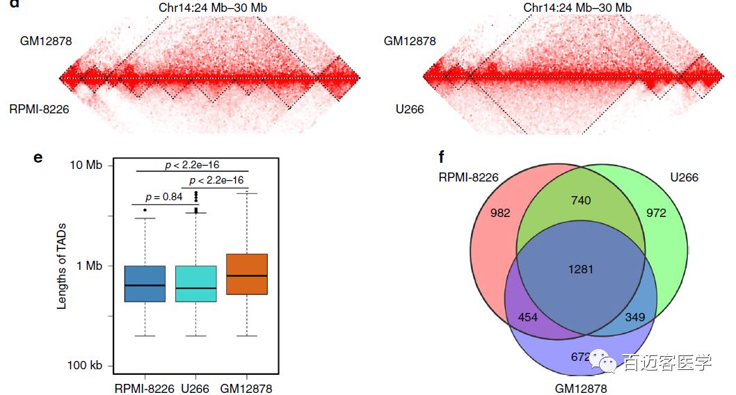 此外,GM12878、RPMI-8226和U266細(xì)胞中分別識(shí)別出了2756、3457和3342個(gè)TAD,TAD大小中值分別為800?kb、600?kb和640 kb。兩種MM細(xì)胞TAD數(shù)量較B細(xì)胞均增加1.2倍,且MM細(xì)胞TAD長(zhǎng)度較小。作者在3個(gè)樣本中鑒定出1281個(gè)保守TAD(TAD重疊超過70%),而僅在2個(gè)MM細(xì)胞存在的保守TAD有740個(gè)。