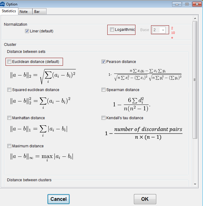 定義顏色標(biāo)尺連續(xù)或不連續(xù),右鍵Set up bar;Set up statistic: 設(shè)置繪制此熱圖使用到的數(shù)學(xué)上的屬性(歸一化和聚類方法),一般二代數(shù)據(jù)選擇對數(shù)歸一化方式。