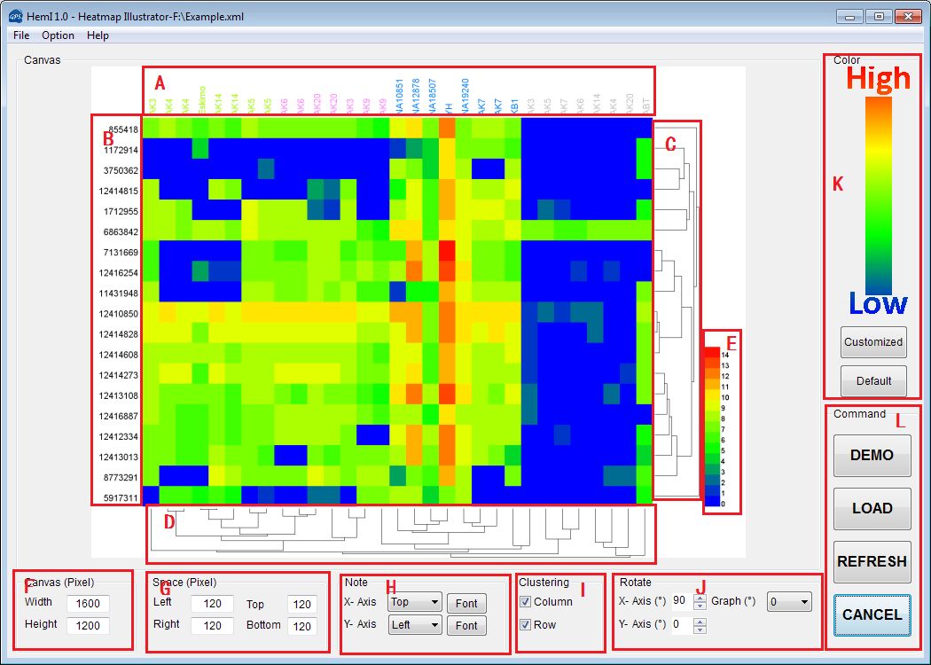 A: 列標(biāo)題。B: 行標(biāo)題。C: 行聚類效果。D: 列聚類效果。E: 顏色標(biāo)尺。F: 畫布大小(像素)。G: A (頂部)/D (底部) 的高度和B (左側(cè))/C (右側(cè))的寬度。(像素)