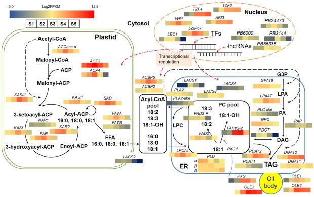 蓖麻油酸是一種高價(jià)值的羥基脂肪酸,具有十分廣泛的工業(yè)應(yīng)用前景。風(fēng)箏果種子中含有約80%的蓖麻油酸,是該不飽和脂肪酸的新來源。為了探究蓖麻油酸在體內(nèi)合成和調(diào)控的分子機(jī)制,本研究收取不同發(fā)育階段的風(fēng)箏果種子進(jìn)行脂肪含量分析并發(fā)現(xiàn),在種子發(fā)育的前中期(授粉后的16-22天),蓖麻油酸迅速富集。結(jié)合二代和三代全長轉(zhuǎn)錄組測序,共鑒定到12,555個(gè)差異轉(zhuǎn)錄本,其中GO注釋富集到與脂質(zhì)代謝相關(guān)的96條term共1,049個(gè)DEGs;454個(gè)DEGs 富集到16條脂質(zhì)代謝相關(guān)的KEGG通路中。綜合分析,共鑒定到包括參與脂質(zhì)代謝的71種酶,246個(gè)潛在的轉(zhuǎn)錄因子及124個(gè)長鏈非編碼RNA(lncRNAs);其中有12個(gè)基因參與多種脂質(zhì)代謝通絡(luò),如脂肪酸的生物合成和修飾(羥基化)、脂質(zhì)轉(zhuǎn)運(yùn)、三酰甘油合成、酰基編輯和脂滴形成等,且在種子發(fā)育過程中,呈現(xiàn)高表達(dá)水平,并與蓖麻油酸的累積模式一致。通過共表達(dá)網(wǎng)絡(luò)分析,還鑒定到57個(gè)轉(zhuǎn)錄因子和35個(gè)lncRNA與蓖麻油酸的合成有關(guān)。本研究結(jié)果為在轉(zhuǎn)錄水平上開發(fā)一種新的蓖麻油酸原料奠定了基礎(chǔ),為其他植物中蓖麻油酸的生產(chǎn)提供了有價(jià)值的候選基因。