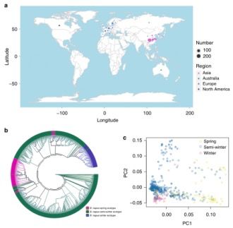 作為較早的異源多倍體作物之一,B.napus通過B. rapa和B.oleracea雜交形成,估計(jì)甘藍(lán)型油菜(B.napus)的形成時(shí)間為~6700和~7500年前及38000-51000年前。文獻(xiàn)中記載,冬季甘藍(lán)型油菜首次在歐洲種植,大約在1700年,春季甘藍(lán)型油菜開始種植并在18世紀(jì)末傳播到英國,半冬生態(tài)型主要在中國種植,在1930 – 1940年間從歐洲引入。然而,并沒有真正已知的野生甘藍(lán)型油菜(B.napus)群體,導(dǎo)致雜交形成B.napus的兩個(gè)祖先種的√確身份仍然難以捉摸,因?yàn)?em>B. rapa和B. oleracea具有形態(tài)多樣的亞種,并且通常在整個(gè)歐洲種植了幾百年。這些物種之間的天然雜交偶然性地在適當(dāng)?shù)臈l件下發(fā)生。雖然最近的一項(xiàng)研究表明甘藍(lán)型油菜(B.napus)的A亞基因組可能來源于歐洲蕪菁(B. rapa ssp. rapa)的祖先,但是由于僅5份B.napus和27份?B. rapa種質(zhì)被納入該項(xiàng)分析中,因此需要提供更多支持該結(jié)論的證據(jù)。先前基于細(xì)胞核和葉綠體標(biāo)記的研究也表明,甘藍(lán)型油菜可能是從蘿卜和西蘭花之間的種間雜交發(fā)育而來,或是由幾個(gè)獨(dú)立的雜交事件形成的。為了進(jìn)一步了解甘藍(lán)型油菜的進(jìn)化,有必要揭示野生種或馴化種的供體是否是親本祖先,其中B. rapa和B. oleracea亞種參與甘藍(lán)型油菜的形成。