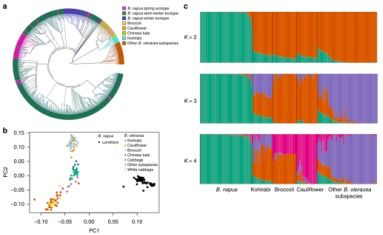 基于*佳模型(Bna, BraA和BolC SNPs集合分別采用GTR+F+ASC+R5, GTR+F+ASC+R7?和?TVM+F+ASC+R8模型),利用IQ-TREE構(gòu)建(ML) trees(圖1a,2a,3a),結(jié)果顯示,B. napus和B. rapa,B. oleracea各自具有一個(gè)分枝。大部分甘藍(lán)型油菜(B.napus)依據(jù)生態(tài)型聚類到一起,而B. rapa和B. oleracea的聚類主要反映了亞種間的關(guān)系。BraA的系統(tǒng)發(fā)育關(guān)系顯示,甘藍(lán)型油菜(B.napus)的親緣關(guān)系更接近于European turnip(歐洲蕪菁),并與B. rapa?ssp.?rapa?(亞洲蕪菁)及其它亞種親緣關(guān)系較遠(yuǎn)(圖2a),而這正與最近的一項(xiàng)研究結(jié)果相一致,即甘藍(lán)型油菜(B. napus)的A亞基因組是從歐洲蕪菁的祖先進(jìn)化而來的;通過動(dòng)態(tài)演化情境模擬進(jìn)一步分析顯示,在大約~106-1,170年前,從歐洲蕪菁到甘藍(lán)型油菜A亞基因組發(fā)生了基因交流(fastsimcoal2);PCA主成分分析顯示,甘藍(lán)型油菜地方品種(B. napus?landraces,n = 50,1980年前登記)更接近歐洲蕪菁(n = 33)(圖2b)。群體結(jié)構(gòu)分析顯示,當(dāng)K=2時(shí),為佳的分群數(shù)(圖2c),其明確的將甘藍(lán)型油菜的地方品種與歐洲蕪菁分開,進(jìn)一步支持了甘藍(lán)型油菜A亞基因組的進(jìn)化歷史。