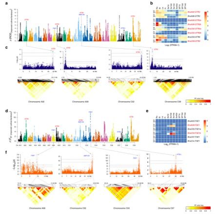 為了鑒定與11個(gè)農(nóng)藝性狀相關(guān)的候選基因,研究人員利用了多位點(diǎn)隨機(jī)混合線性模型mrMLM v1.3進(jìn)行全基因組關(guān)聯(lián)分析研究(genome-wide association studies)。為了獲得高質(zhì)量的SNPs,研究人員對Bna SNP集合進(jìn)行了估算,保留了670,028個(gè)SNP,MAF> 5%,用于后續(xù)的GWAS分析。通過19個(gè)樣品多態(tài)性核苷酸和Sanger測序結(jié)果的評估比較,表明98.74%的推算基因型是正確的,20份種質(zhì)的兩個(gè)生物學(xué)重復(fù)推算的與真實(shí)的基因型的平均系數(shù)(r2)為0.956,最小值和最大值范圍從0.928到0.967,進(jìn)一步證實(shí)推算的基因型的z確性。最終共計(jì)鑒定了與10個(gè)目標(biāo)性狀顯著相關(guān)的60個(gè)位點(diǎn),其中5個(gè)與種子產(chǎn)量相關(guān),3個(gè)與長角果長度相關(guān),4個(gè)與油脂含量相關(guān),48個(gè)與種子質(zhì)量相關(guān)(圖4c),此外,3個(gè)位點(diǎn)在閾值范圍內(nèi)顯示與開花時(shí)間相關(guān),與種子質(zhì)量性狀顯著相關(guān)的SNPs解釋了14.30%?到35.47%的表型變異,高于種子產(chǎn)量(16.81%)和含油量(20.64%),此外,本研究中還檢測到與先前的GWAS研究中與種子質(zhì)量相關(guān)的大部分基因座。由于與油含量和產(chǎn)量的相關(guān)性狀是復(fù)雜的并容易受到環(huán)境變化影響,研究人員將本研究中重要的基因座位與前期研究的QTLs位點(diǎn)進(jìn)行了整合。因此,在受選擇區(qū)與QTLs定位區(qū)域內(nèi),基于功能注釋和轉(zhuǎn)錄組分析控制不同性狀的候選基因被鑒定,如下分析。