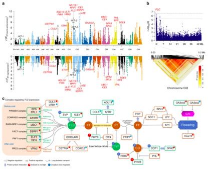 研究人員在FLOR-ID(FLOweRing Interactive Database)中檢索到了306個(gè)基因與擬南芥開花時(shí)間相關(guān),在甘藍(lán)型油菜中鑒定了1,225個(gè)直系同源基因。在兩組比對中,24?個(gè)開花時(shí)間相關(guān)基因同時(shí)坐落在受選擇區(qū)域中(圖5a,c),其中22個(gè)分布在C亞基因組上,主要通過春化和光周期途徑調(diào)節(jié)開花時(shí)間。特別地,FLC基因座及其染色質(zhì)介導(dǎo)的調(diào)節(jié)原件將是調(diào)控甘藍(lán)型油菜開花時(shí)間的*有希望的靶標(biāo)。