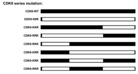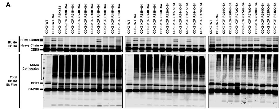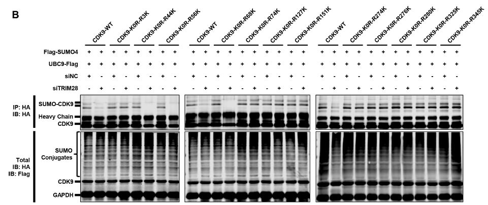 接下來作者試圖鑒定應(yīng)該在CDK9?賴氨酸殘基上發(fā)生的SUMO化位點(diǎn)。賴氨酸突變實(shí)驗(yàn)結(jié)果:CDK9-K0R突變體含有所有賴氨酸變?yōu)榫彼岬耐蛔儯耆兄沽薈DK9被SUMO化的能力;其他CDK9突變體仍然能夠通過TRIM28進(jìn)行SUMO化,這表明在整個(gè)CDK9序列中可能存在多個(gè)SUMOylation位點(diǎn)。采用基于CDK9-K0R全突變體的逆轉(zhuǎn)突變策略,發(fā)現(xiàn)CDK9上的幾個(gè)賴氨酸顯著SUMO化。其中,多個(gè)SUMO化位點(diǎn)與CDK9 C-末端自身磷酸化位點(diǎn)相鄰,據(jù)報(bào)道這些位點(diǎn)是Tat-P-TEFb與TAR RNA高親和力結(jié)合所必需的,即?SUMO化可以通過阻止相鄰的磷酸化來降低結(jié)合能力。