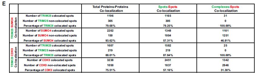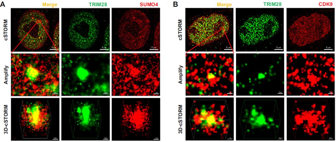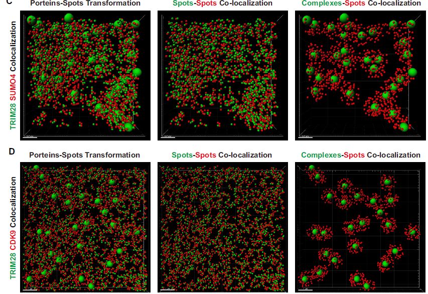 為了確定TRIM28是否與CDK9結(jié)合,作者使用超分辨率的連續(xù)隨機(jī)光學(xué)重建顯微鏡(cSTORM)來研究分辨率為20nm二者間的三維(3D)共定位。TRIM28存在于細(xì)胞核中,與點(diǎn)狀SUMO4共定位。放大視圖和3D-cSTORM,發(fā)現(xiàn)SUMO4蛋白被TRIM28富集并形成大斑點(diǎn)。CDK9存在于細(xì)胞核內(nèi)的分散點(diǎn)中,但仍發(fā)現(xiàn)CDK9與TRIM28共定位。與SUMO4類似,CDK9蛋白被TRIM28富集并包圍TRIM28。近80%的TRIM28斑點(diǎn)或復(fù)合物與94%的SUMO4斑點(diǎn)共定位,88%的TRIM28斑點(diǎn)或復(fù)合物與76%的CDK9斑點(diǎn)共定位。
