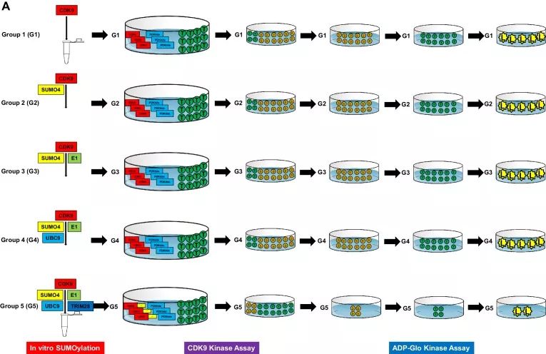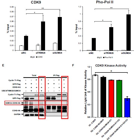 Co-IP實(shí)驗(yàn)發(fā)現(xiàn)細(xì)胞周期蛋白Cyclin T1僅與野生型CDK9結(jié)合形成正性轉(zhuǎn)錄延伸因子P-TEFb復(fù)合物,而不是SUMO化的CDK9。為了研究TRIM28介導(dǎo)的CDK9 SUMO化是否影響CDK9的激酶活性,進(jìn)行了體外CDK9 SUMO化測定和CDK9激酶活性測定:發(fā)現(xiàn)當(dāng)TRIM28 SUMO化CDK9時(shí),CDK9的激酶活性顯著降低。不添加TRIM28,CDK9的激酶活性不受影響,盡管已添加其他SUMO化組分。