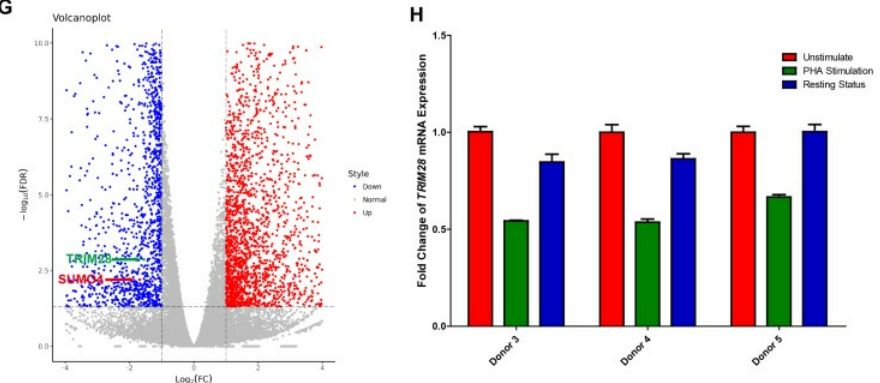 通過實(shí)驗(yàn)發(fā)現(xiàn)si-TRIM28過表達(dá)抑制了HIV-1啟動(dòng)子活性的基礎(chǔ)水平,并以劑量依賴的方式挽救了HIV-1抑制;當(dāng)與HIV-1 Tat和TNFα組合過表達(dá)時(shí),上調(diào)更顯著;TRIM28在多種細(xì)胞系和原代細(xì)胞中普遍表達(dá)。為搜索HIV-1潛伏相關(guān)基因,作者利用RNA-Seq比較未刺激和PHA刺激的原代CD4+?T細(xì)胞中的基因表達(dá)作為補(bǔ)充實(shí)驗(yàn),TRIM28在未刺激的原代CD4+?T細(xì)胞中高表達(dá),并在PHA激活后下調(diào)。當(dāng)活化的CD4+?T細(xì)胞恢復(fù)到靜止?fàn)顟B(tài)時(shí),TRIM28的表達(dá)再次上調(diào)。為了測試TRIM28是否有助于HIV-1潛伏,在HIV-1潛伏細(xì)胞系J-Lat 10.6以及其他HIV潛伏細(xì)胞系模型(J-Lat 6.3/8.4/9.2和15.4)中敲低了TRIM28,發(fā)現(xiàn)TRIM28的缺失上調(diào)了HIV-1的表達(dá)。此外,當(dāng)補(bǔ)充廣泛定義的LRA:組蛋白去乙?;福℉DAC)抑制劑SAHA或BET結(jié)構(gòu)域抑制劑JQ-1時(shí),HIV-1重新激活增強(qiáng)得更高。