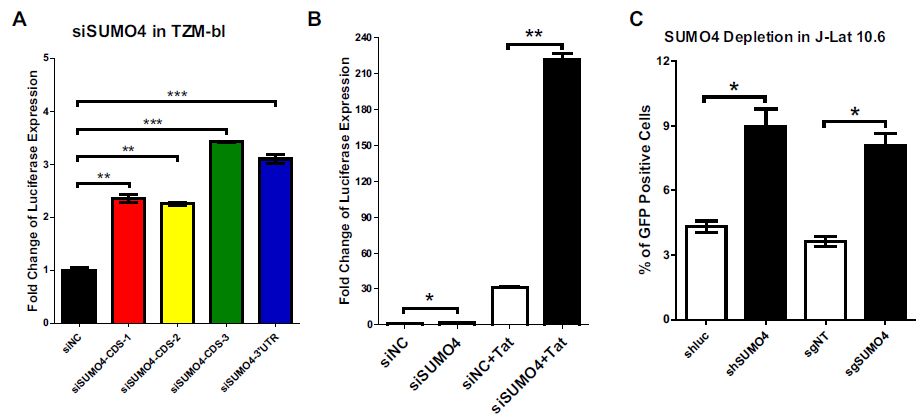 前面siRNA文庫篩選中,SUMO4缺失比其他SUMO旁系同源物缺失更顯著上調(diào)HIV-1啟動(dòng)子活性。當(dāng)與HIV-1 Tat過表達(dá)組合時(shí),上調(diào)更顯著,其現(xiàn)象與TRIM28實(shí)驗(yàn)中觀察到的相似。SUMO4的敲低或敲除也能夠在J-Lat 10.6中重新激活潛在的假HIV-1。原代CD4+?T細(xì)胞被PHA刺激后,SUMO4的表達(dá)下調(diào),恢復(fù)到靜止期后達(dá)SUMO4表達(dá)恢復(fù)到基礎(chǔ)水平。