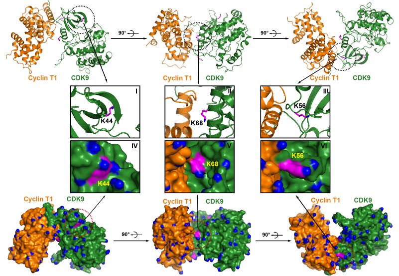 為了進(jìn)一步確定哪些位點(diǎn)確實(shí)僅被TRIM28 SUMO化,作者敲除了內(nèi)源性TRIM28并測試了上述鑒定候選位點(diǎn)的SUMO化潛力,發(fā)現(xiàn)Lys44、Lys56和Lys68的SUMO 化信號(hào)在缺乏內(nèi)源性TRIM28時(shí)完全消失,進(jìn)一步支持這些位點(diǎn)被TRIM28特異性SUMO化。直接分析富集的SUMO-CDK9的靶特異性SUMO-MS也證實(shí)了該結(jié)果。Lys44的乙?;瞧浼っ富钚运匦璧?,其他2個(gè)SUMO化位點(diǎn)Lys56和Lys68在CDK9和細(xì)胞周期蛋白T1的相互作用區(qū)域內(nèi)。SUMO蛋白是多肽大分子,它的存在可以形成空間位阻,從而阻止P-TEFb復(fù)合物的形成。