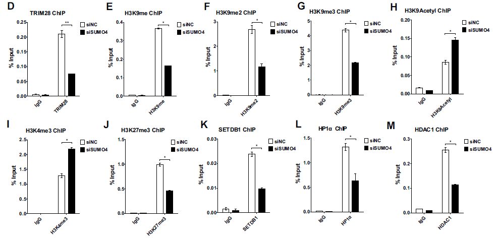 接下來探究了SUMO4是否可以影響TRIM28的功能和HIV-1啟動(dòng)子的表觀遺傳狀態(tài):SUMO4敲低后,超過一半的TRIM28從HIV-1 LTR中丟失,表明TRIM28在HIV-1 LTR上的富集可能是部分SUMOylation依賴性的;SUMO4敲低后H3K9me、H3K9me2和H3K9me3在HIV-1 LTR上顯著降低,以及H3K9甲基化’writer’ SETDB1和’reader’ HP1α顯著降低;H3K9乙?;虷3K4me3的顯著上調(diào)和HDAC1的下調(diào),這與先前報(bào)道TRIM28以SUMO化依賴性方式募集SETDB1、HP1α和HDAC1一致;H3K27me3在HIV-1 LTR上也降低。一些多梳抑制復(fù)合物2(PRC2)組分如EZH2和SUZ12(H3K27me3的主要’writer’)可能被SUMO4 SUMO化,導(dǎo)致修飾功能的增強(qiáng)。
