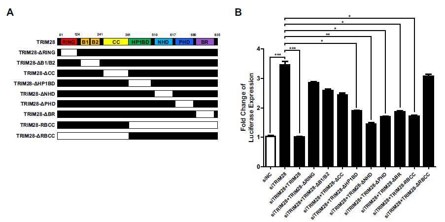 接下來,作者通過構(gòu)建TRIM28不同區(qū)域的缺失突變體探究該蛋白功能。TRIM28是一種多功能蛋白,含有7個(gè)不同的結(jié)構(gòu)域:由鄰近的植物同源域(PHD)SUMO化的C-末端溴結(jié)構(gòu)域(BR),以SUMOylation依賴性方式募集SETDB1和NuRD復(fù)合物;N端三聯(lián)體基序RBCC區(qū)域由RING指結(jié)構(gòu)域(RING)、2個(gè)B-box domians(BB)和卷曲螺旋域(CC)組成。 TRIM28的RING起分子間SUMO E3連接酶的作用,而PHD對(duì)分子內(nèi)SUMO E3連接酶活性很重要。