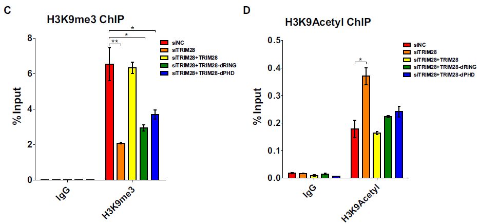 免疫共沉淀(Co-IP)實(shí)驗(yàn)發(fā)現(xiàn)即使在RNase存在下CDK9也與TRIM28結(jié)合。為了鑒定TRIM28的哪個(gè)區(qū)域與CDK9結(jié)合,構(gòu)建各種TRIM28缺失突變體以富集CDK9:RING結(jié)構(gòu)域缺失中止了CDK9的結(jié)合以及CDK9的SUMO化。實(shí)驗(yàn)表明外源表達(dá)的TRIM28也與CDK9共定位??傊?,研究表明RING和PHD都具有E3連接酶活性并富集UBC9。