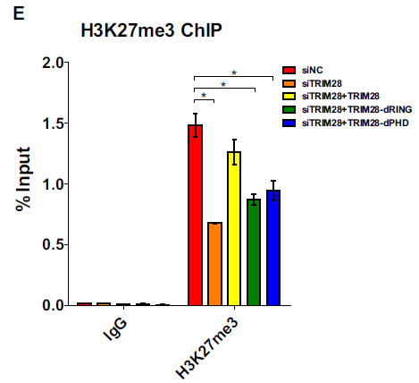 HP1BD、NHD或BR缺失突變體,尤其是具有分子內(nèi)SUMO E3連接酶活性的PHD突變體,沒有能夠顯著地挽救抑制作用;RING或RBCC結(jié)構(gòu)域缺失突變體完全中止了再抑制,這可能是由于Krüppel相關(guān)的盒結(jié)構(gòu)域鋅指(KRAB-ZNFs)結(jié)合能力的喪失;而僅含有RBCC的突變體(TRIM28-RBCC)仍然恢復(fù)了抑制作用。野生型TRIM28能夠拯救抑制性表觀遺傳標(biāo)記H3K9me3和H3K27me3并抑制活性表觀遺傳標(biāo)記H3K9乙酰化,然而,沒有RING或PHD結(jié)構(gòu)域的突變體僅能夠挽救部分抑制標(biāo)記。因此,作者假設(shè)TRIM28可利用RING結(jié)構(gòu)域SUMO化對(duì)HIV-1表達(dá)至關(guān)重要的細(xì)胞蛋白。