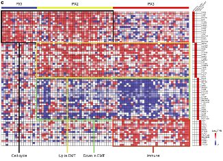 該研究共鑒定到11340個不同的基因產(chǎn)物,覆蓋了腫瘤細(xì)胞及腫瘤微環(huán)境所有可能表達(dá)的蛋白。研究人員對胃癌與癌旁組織全蛋白表達(dá)譜進(jìn)行聚類分析,將彌漫型胃癌分為三個分子亞型(PX1~3),且這三個亞型與生存預(yù)后和化療敏感性密切相關(guān)。這是世界上實(shí)現(xiàn)在蛋白層面上對腫瘤進(jìn)行分子分型,且分的的亞型與預(yù)后和化療有顯著性關(guān)聯(lián)。其中PX1型(細(xì)胞周期型),總生存時間最長;PX2型 (上皮-間充質(zhì)轉(zhuǎn)化型),生存預(yù)后介于PX1和PX3之間;PX3 (免疫通路富集型)患者腫瘤組織高表達(dá)蛋白富集在免疫響應(yīng)相關(guān)通路和EMT相關(guān)蛋白上,總生存時間最短,并且該組患者對化療不敏感。