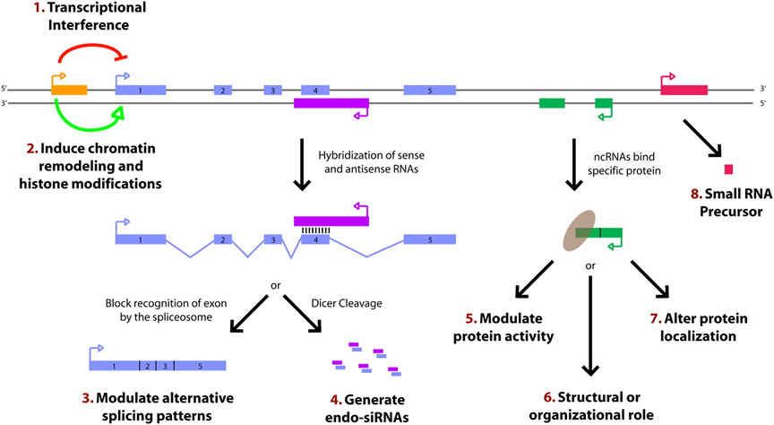 3.與基因轉(zhuǎn)錄本形成互補雙鏈,干擾mRNA的剪切,形成不同的剪切形式;