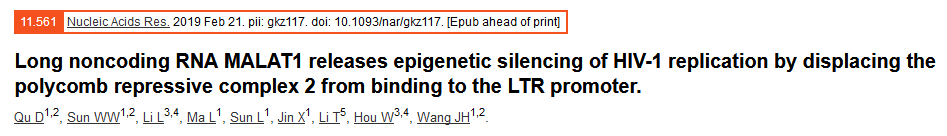 Qu D, Sun WW, Li L,?et al.?Long noncoding RNA MALAT1 releases epigenetic silencing of HIV-1 replication by displacing the polycomb repressive complex 2 from binding to the LTR promoter.?Nucleic Acids Res.?2019 Feb 21.