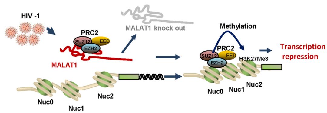 作者在這里發(fā)現(xiàn)MALAT1通過與PRC2的結合,將EZH2從與HIV-1 LTR啟動子的結合中分離出來,從而清除了PRC2 復合物介導的組蛋白H3第27位賴氨酸上的三甲基化(H3K27me3),進而緩解了HIV-1轉(zhuǎn)錄的表觀遺傳沉默。此外,用潛伏期逆轉(zhuǎn)劑(LRA)刺激HIV-1的再激活可誘導潛伏感染細胞中MALAT1的表達。成功的聯(lián)合抗逆轉(zhuǎn)錄病毒療法(cART)的患者伴有MALAT1表達顯著減少,說明MALAT1表達與HIV-1復制呈正相關。因此作者的研究確認了MALAT1對HIV-1轉(zhuǎn)錄的促進作用,且MALAT1可能是新療法的潛在靶點。