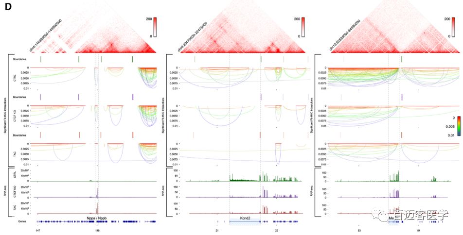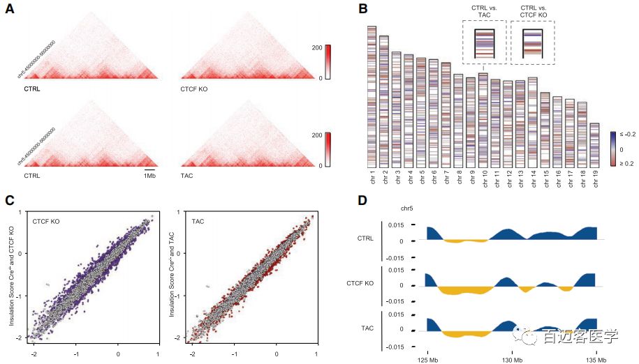 正常對照成年小鼠(CTRL)和兩個不同的疾病模型(TAC、CTCF-KO)小鼠的Hi-C結果揭示了5 kb分辨率下心肌細胞的基因組相互作用,得到了染色體內和染色體間的互作事件,并為未來的心臟表觀基因組研究提供了依據。壓力超載或CTCF缺失選擇性地改變了TAD的邊界強度和A/B?compartment、基因組可及性。心力衰竭涉及致病基因周圍染色質互作穩(wěn)定性的降低。此外,壓力超負荷或CTCF缺失重塑了心臟增強子的長距離互作,導致這些功能元件周圍局部染色質互作顯著減少。
