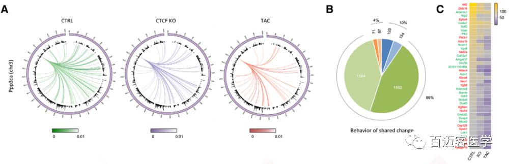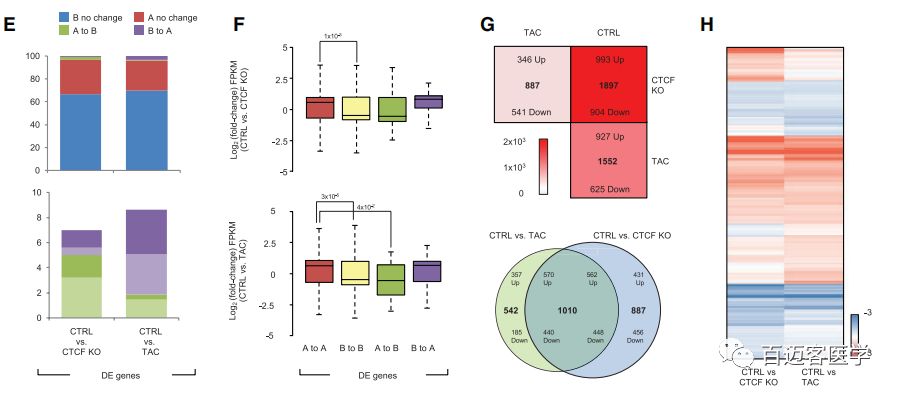 CTCF的缺失或TAC對染色體的A compartment和B?compartment的影響較小,而其中發(fā)生compartment轉換的區(qū)域與基因表達呈正相關,即從A?compartment到B?compartment轉換區(qū)域的基因表達下調,從B?compartment到A?compartment轉換區(qū)域的基因表達上調。CTCF-KO、TAC小鼠間存在41%的共有差異表達基因,兩者都表現(xiàn)出已知的標志基因激活。ChIP-seq檢測到CTCF靶向基因的轉錄起始位點,而這些基因富集在與心臟病相關的通路中。