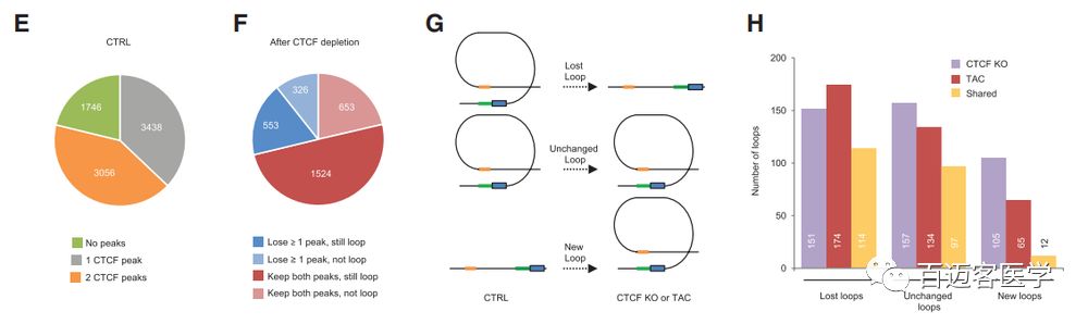 CTCF-KO、TAC小鼠的染色體長距離loop大小沒有明顯變化,但loop總數(shù)量減少。相比于對照組,CTCF-KO和TAC中消失的長距離loop中有51%兩者共有的,而新出現(xiàn)的loop中只有15%是兩者共有的;在疾病細胞中丟失的loop數(shù)大于新形成的loop數(shù)。在疾病細胞中發(fā)生重組(丟失/新形成)的loop中,富集與心血管功能相關通路中的基因。此外,重組loop中亦包含大量增強子–啟動子loop,其中在疾病細胞中丟失的loop富集與心臟病理相關的基因。