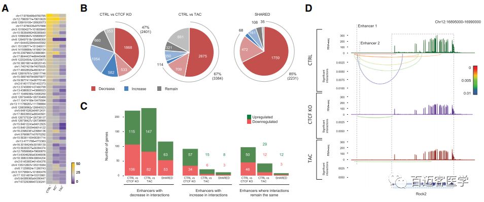 在先前鑒定的成人心肌細胞增強子中,其中有115050個再本研究中存在互作。這些增強子的互作在疾病細胞中減少。事實上,其中47%在CTCF-KO中表現(xiàn)出了互作減少,67%在TAC中表現(xiàn)出互作減少。兩種疾病細胞中共有的增強子中,85%在兩者中均出現(xiàn)互作減少。且兩種疾病細胞中基因表達變化與其增強子-基因互作的減弱有關,且受影響的基因在心臟病理通路中富集,如Rock2