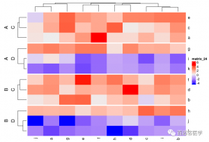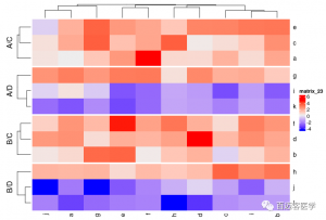Heatmap(mat,?split?=?data.frame(rep(c(“A”,?“B”),?6),?rep(c(“C”,?“D”),?each?=?6)),?combined_name_fun?=?function(x)?paste(x,?collapse?=?“\n”))4)熱圖的簡單注釋