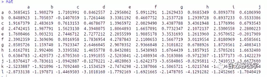 mat?=?matrix(rnorm(80,?2),?8,?10)?#產(chǎn)生一個8行10列共80個平均值是2的矩陣