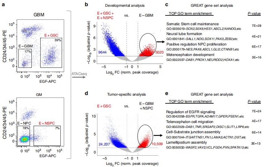 通過熒光激活細胞分選術(shù)(FACS)從GM和GBM組織中分離的細胞GSC(EGF+/-)、NSPC(EGF+/-),分別進行ATAC-seq。