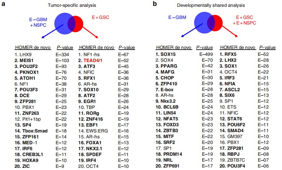 通過ATAC-seq分析染色質(zhì)的可及性,不僅可以識別轉(zhuǎn)錄的調(diào)控區(qū)域,還可以推斷出其中的TF活性。在此,作者鑒定了27個GSC腫瘤特異性的TF motif,26個在E+GSC和E+NSPC中共有的發(fā)育相關(guān)TF motif。其中,TEAD1/4是具有很高活性的TF( motif是GSC特有peak中顯著富集,且基因表達水平高),其它候選TF包括ATF3、RFX1、FOXA1等。而E+GSC和E+NSPC中共有的發(fā)育相關(guān)TF包括SOX1、IRF3、NFIA等。然后,作者利用以前的類似的E+/E-GBM的RNA-seq數(shù)據(jù),考慮到腫瘤特異性TF的基因表達水平,其中只有TEAD1在E+GSC中差異過表達。