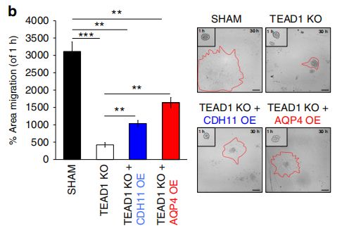 作者通過ATAC-seq和轉(zhuǎn)錄組測序數(shù)據(jù)篩選出來TEAD1的候選靶基因,并進一步利用ChIP-PCR,驗證了與TEAD1結(jié)合的靶基因–AQP4、EGFR和CDH4。TEAD1敲除使AQP4下調(diào),TEAD1過表達可恢復(fù)AQP4的表達,而TEAD1和AQP4過表達均可修復(fù)TEAD1KO細胞的遷移缺陷,說明TEAD1作用于靶基因AQP4,調(diào)控其表達,進而參與GBM遷移的直接調(diào)控機制。