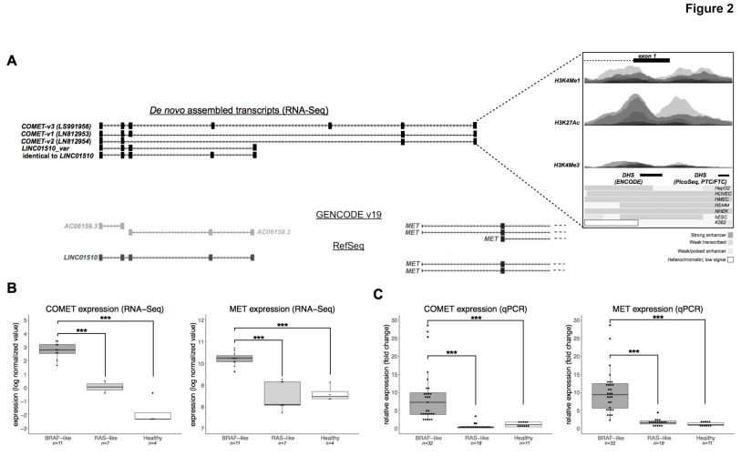 為了探索PTC中BRAF和RAS樣特異性lncRNA模式,首先在最近發(fā)表的來自22個甲狀腺活組織的RNA-Seq數(shù)據(jù)集中建立了從頭轉(zhuǎn)錄組裝的計算工作流程,定義一個新的PTC模型轉(zhuǎn)錄組。大于200nt低編碼潛能且與已注釋基因位點無重疊的轉(zhuǎn)錄本鑒定出454個新的lncRNA。與蛋白質(zhì)編碼基因類似,已知和新發(fā)現(xiàn)的lncRNA在患者和對照之間具有顯著差異的表達水平(FDR <0.05)。202個lncRNAs的表達在BRAF和RAS樣PTC之間存在顯著差異(其中77個在BRAF樣PTC中過表達,125個低表達),其中60個未在公共數(shù)據(jù)庫中注釋(圖1D和1E;FDR <0.05)。因此,為鑒定尚未注釋的lncRNAs :i)在PTC中異常表達,ii)在BRAF-和RAS樣亞組之間差異表達,iii)在附近定位和iv)與已知癌癥驅(qū)動基因高度相關,作者使用“最近轉(zhuǎn)錄起始位點”(TSS)方法選擇mRNAs / lncRNAs對。有趣的是,基于這些標準,將COMET(COrrelated-to-MET)鑒定為新的lncRNA,與MET癌基因正相關(r = 0.7)。