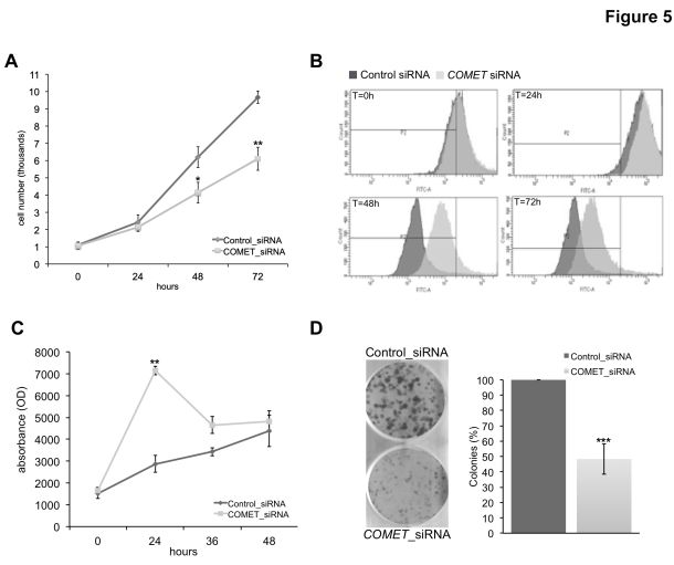為了驗證COMET表達作為Ret和B-Raf蛋白組成型激活的下游轉(zhuǎn)錄事件,檢測了攜帶BRAFV600E突變(BCPAP)或RET基因重排(TPC-1)的PTC細胞系中的COMET水平與永生化正常甲狀腺細胞系(Nthy-ori 3-1)的比較 。正如所料,COMET以及MET在BRAF樣細胞系中的表達顯著高于正常細胞(圖3A); 顯示最高COMET表達水平的TPC-1細胞系用作下一步大多數(shù)表型測定的體外模型。