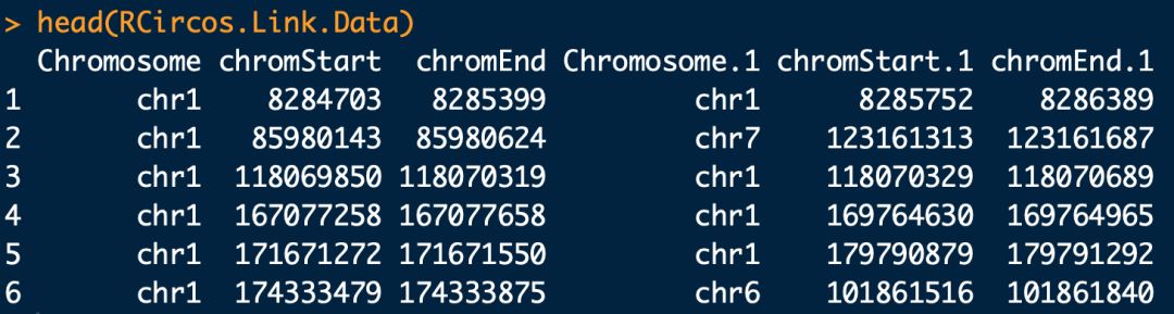 #?數(shù)據(jù)內(nèi)容如上圖,第一列?染色體編號(hào);第二列?聯(lián)系位點(diǎn)在染色體片段的起始位點(diǎn);第三列?聯(lián)系位點(diǎn)在染色體片段的結(jié)束位點(diǎn);第四列?聯(lián)系位點(diǎn)在所在的另一個(gè)染色體編號(hào);第五列?聯(lián)系位點(diǎn)在所在的另一個(gè)染色體片段的起始位點(diǎn);第六列?聯(lián)系位點(diǎn)在所在的另一個(gè)染色體片段的結(jié)束位點(diǎn)