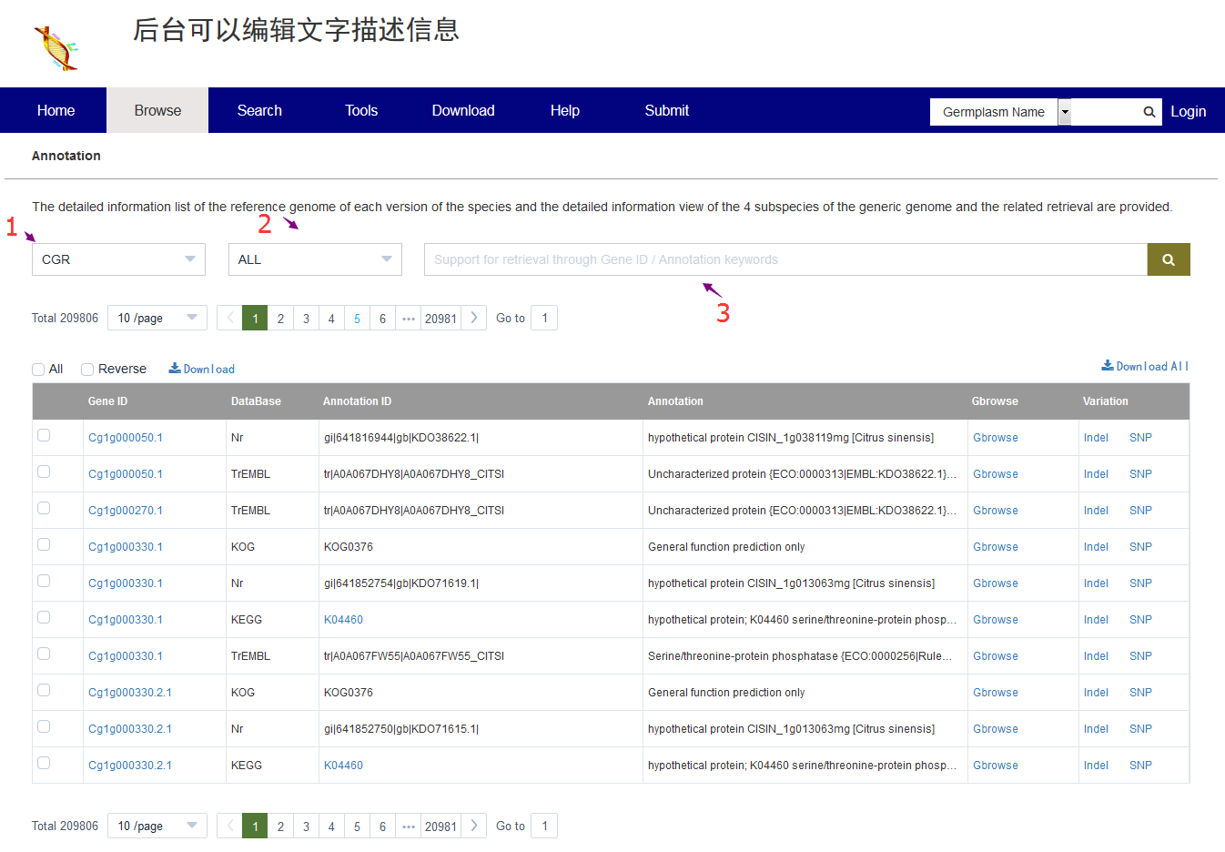 標準版Browse模塊中共部署了7個子模塊進行核心數(shù)據(jù)的瀏覽,如Browse中的Annotation模塊,鏈接:http://tomato.biocloud.net/page/browse/Annotation