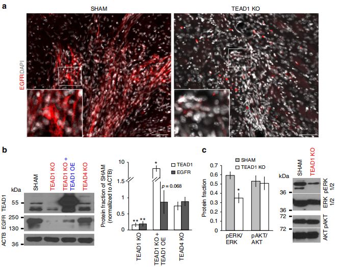 TEAD1KO異種移植樣本中EGFR的表達(dá)水平低于對(duì)照樣本,且TEAD1KO細(xì)胞系中EGFR表達(dá)相比于正常對(duì)照細(xì)胞系顯著下調(diào),TEAD1過(guò)表達(dá)后EGFR表達(dá)有回升。對(duì)EGFR下游信號(hào)元件的表達(dá)水平的檢測(cè)發(fā)現(xiàn),pERK在TEAD1KO細(xì)胞中下調(diào),而pAKT則不同。TEAD1KO細(xì)胞經(jīng)過(guò)較長(zhǎng)時(shí)間的培養(yǎng)后,EGFR表達(dá)恢復(fù),而遷移仍受影響。因此,TEAD1直接且短暫地調(diào)控EGFR