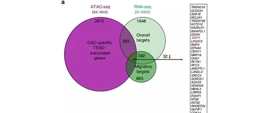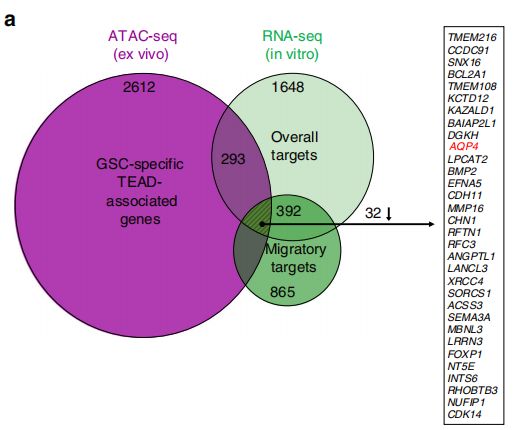 GSC中TEAD1可接近區(qū)域peak(ATAC-seq)和基因表達(dá)水平(RNA-seq)的一致性分析,結(jié)合GBM中TEAD1與基因共表達(dá)(TCGA中的GBM RNA-seq數(shù)據(jù))分析,發(fā)現(xiàn)TEAD1的靶基因包括EGFR、AQP4、CDH4、TNC等多個(gè)候選靶基因。