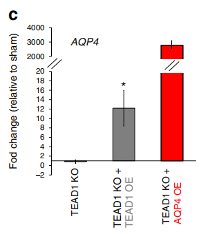 作者通過(guò)ATAC-seq和轉(zhuǎn)錄組測(cè)序數(shù)據(jù)篩選出來(lái)TEAD1的候選靶基因,并進(jìn)一步利用ChIP-PCR,驗(yàn)證了與TEAD1結(jié)合的靶基因–AQP4、EGFRCDH4。TEAD1敲除使AQP4下調(diào),TEAD1過(guò)表達(dá)可恢復(fù)AQP4的表達(dá),而TEAD1和AQP4過(guò)表達(dá)均可修復(fù)TEAD1KO細(xì)胞的遷移缺陷,說(shuō)明TEAD1作用于靶基因AQP4,調(diào)控其表達(dá),進(jìn)而參與GBM遷移的直接調(diào)控機(jī)制。