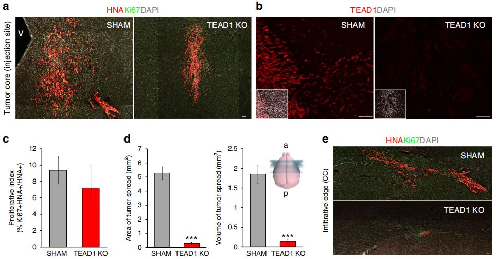 此外,作者分析了所有TEAD家族成員(1-4)在TCGA數(shù)據(jù)庫(kù)RNA-seq數(shù)據(jù)中的表達(dá)水平,發(fā)現(xiàn)TEAD1是150個(gè)GBM樣本中表達(dá)最高的TEAD家族成員,且在蛋白水平上,TEAD1在PDX膠質(zhì)瘤中表達(dá)。因此,TEAD1是GBM腫瘤中表達(dá)最高、表達(dá)最廣泛的TEAD家族成員。