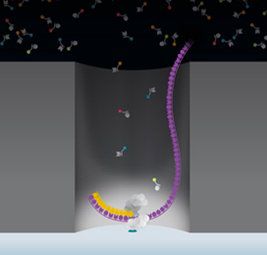 PB的測(cè)序空間為ZMW(zero-mode wave guides,零模波導(dǎo)孔),外徑100多納米,DNA分子掉入孔中,不同熒光標(biāo)記的脫氧核苷酸在聚合酶的作用下,會(huì)產(chǎn)生不同的熒光信號(hào),隨后標(biāo)記基團(tuán)自動(dòng)脫落,維持了信號(hào)的持續(xù)監(jiān)測(cè)。激光從ZMW底部打入,由于孔直徑很小而不能穿過(guò)孔進(jìn)入上方溶液區(qū),從而把背景噪音降到最低。