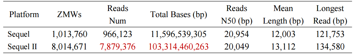 百邁客利用某海洋動(dòng)物樣本通過構(gòu)建相同文庫(kù),進(jìn)行不同平臺(tái)的數(shù)據(jù)測(cè)試。通過構(gòu)建20 Kb的文庫(kù),同時(shí)在Sequel與SequelⅡ上進(jìn)行上機(jī)測(cè)序,數(shù)據(jù)產(chǎn)出結(jié)果如下所示:
