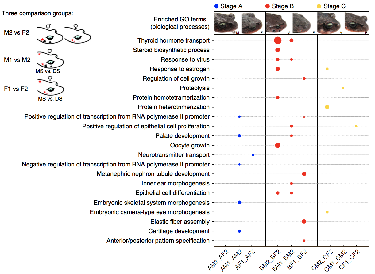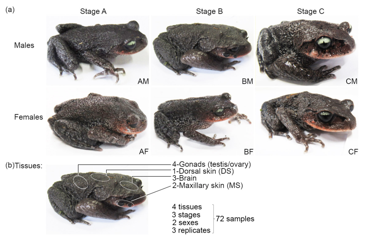 在雌雄異體的有性生物中,兩性之間在體型大小、形態(tài)結(jié)構(gòu)和功能等方面存在明顯差異的現(xiàn)象稱為性二態(tài)(Sexual dimorphism)。自然界普遍存在的性二態(tài)(如劍尾魚的劍狀尾和獅子的鬃毛等)一直是進(jìn)化生物學(xué)家關(guān)注的熱點(diǎn)問題。兩棲動物具有豐富的性二態(tài)特征,繁殖期的雄性雷山髭蟾在上頜的皮膚形成角質(zhì)刺,類似于人類的“胡子”,因此又被稱為“胡子蟾”,繁殖期過后,角質(zhì)刺外殼會脫落,而雌性則沒有這種特征。由于除了性染色體上的基因外,大多數(shù)的基因組在雄性和雌性之間是共享的,所以性二態(tài)往往是由基因在性別間差異性表達(dá)引起的。由于缺乏參考基因組,很少有研究能夠?qū)⑿詣e差異表達(dá)模式與特定的性二態(tài)特征聯(lián)系起來,與性二態(tài)性狀相關(guān)的重要生物學(xué)過程和關(guān)鍵基因也一直難以破解。本文成功的建立了一個(gè)具有代表性的鋤足蟾亞目基因組,并對其皮膚來源的性二態(tài)性狀進(jìn)行了分子基礎(chǔ)的研究。