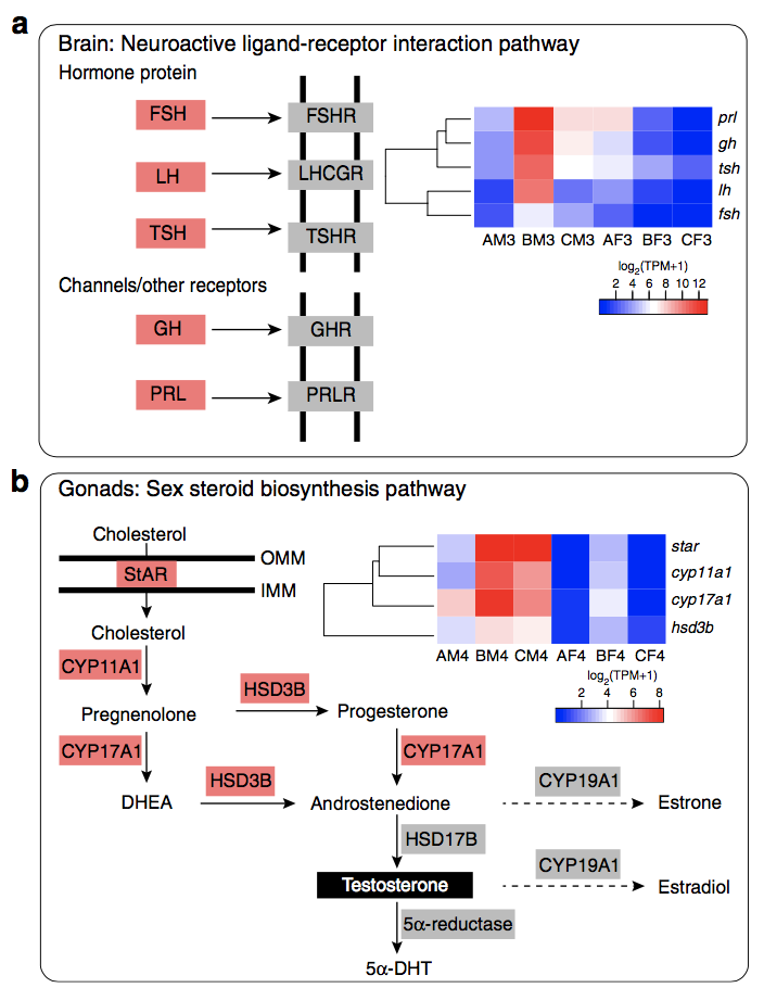 為了探討L.?leishanense中角質(zhì)刺的激素調(diào)節(jié),研究者對來自大腦和性腺的轉(zhuǎn)錄組數(shù)據(jù)進(jìn)行了測序(表2)。研究發(fā)現(xiàn)B期雄性和雌性之間的DEGs(BM3-BF3)和A期和B期雄性之間的DEGs(AM3-BM3)中的神經(jīng)活性配體-受體相互作用途徑顯著富集,在這些基因中,LH(黃體生成素)和FSH(卵泡刺激素)編碼肽激素,通過血液進(jìn)入性腺刺激類固醇激素的合成(圖9)。相關(guān)基因的表達(dá)表明雄性在繁殖季節(jié)中下丘腦-垂體-性腺軸的激活。雄性精巢在不同時(shí)期的類固醇激素生物合成途徑顯著豐富。在這條途徑中,編碼參與性類固醇生物合成的酶的基因在B期雄性精巢中高度表達(dá)(圖9),表明B期雄性精巢中雄激素(睪酮和5α-DHT)生物合成水平較高。